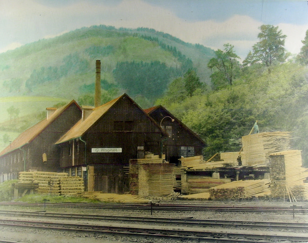 Das historische Bild zeigt unser Gebäude, damals Dampfsägewerk, in den 1920er Jahren mit etwa 50 Mitarbeitern. Ein paar mehr noch, als wir heute sind.